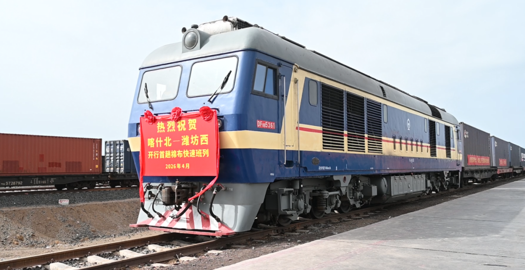 4月14日下午,一列“雪莲号”货运列车在汽笛声中从新疆喀什驶出,满载1300吨新疆棉布奔赴山东潍坊。